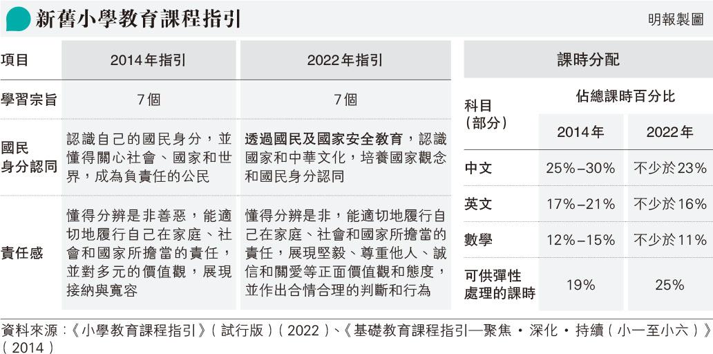 教育 小學新指引 國安列重點 增彈性課時 倡內地交流教憲法 發佈於 3 年 前 2022 年 9 月 9 日 By 明報 【明報專訊】教育局昨公布最新《小學教育課程指引》(下稱《指引》),當中更新七大學習宗旨,包括新提出國家安全教育、培養國民身分認同。《指引》亦提出為學生創造空間,增加學校彈性編排的課時,由現時課時的19%增至不多於25%,並建議學校將彈性課時用作全方位學習活動,包括跨科內地交流考察活動、加強認識中華文化、《憲法》、《基本法》教育及國家安全教育等。 相關文章:價值觀教育內地交流小學小學教育教育局 Up Next 跨媒介宇宙:打開心窗看電影 不要錯過 髮禁調停失敗 林澤駿或採法律行動 繼續閱讀 贊助商 猜你喜歡 大埔浸小下學年遷同區空置校 大埔浸小師生借校復課 銘恩家長學生夾道歡迎 嶺大分拆LIFE 新辦團基金接管 大埔浸小未原校復課 7校單位借場 大埔宏福苑五級火︱教育局向大埔區學校發放特別支援津貼 每間中小學獲10萬、幼稚園5萬 (16:42) 缺課生增 指「三層應急」或漏網 小童群益會倡設專隊家訪