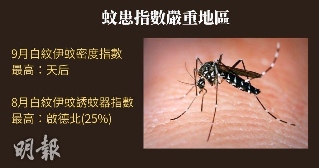 食環署同時公布部分地區本月的白紋伊蚊密度指數,其中天后指數2.5,達最高的第三級別,代表放置誘蚊器附近位置白紋伊蚊數量較多,可以聘請私人滅蟲公司防控蚊患。【9月白紋伊蚊誘蚊器指數及白紋伊蚊密度指數】