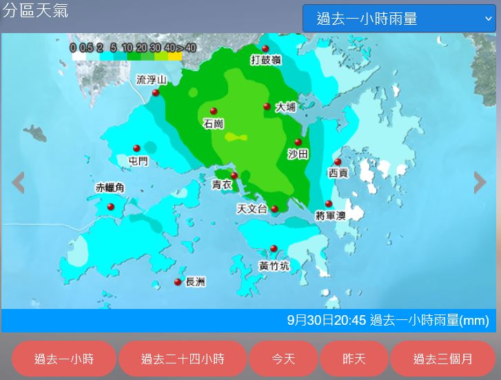 驟雨及雷暴正影響廣東沿岸及南海北部。本港方面,今早(9月30日)九龍錄得約10毫米雨量,大嶼山更錄得超過20毫米雨量。此外,偏東氣流正影響廣東沿岸。
