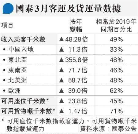 【明報專訊】國泰(0293)公布3月載客人次按年升逾42倍,至132.21萬人次,月內乘客運載率大增近45個百分點至超過90%,反映出行需求持續強勁。計及香港快運在內,客運航班運力在3月底已按計劃達至疫情前50%水平,服務逾70個航點。月內量度客運量的收入客公里數(RPK)增逾48倍,各航線地區中,以日韓為主的東北亞地區增長最勁,按年增近356倍。