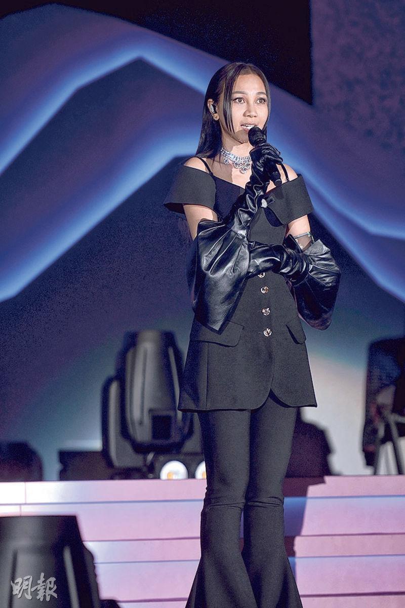 【明報專訊】環球唱片主辦《想 張國榮20周年致敬音樂會》前晚於會展舉行,除黎明、陳慧琳、許志安等獻唱張國榮(哥哥)的經典歌外,還有多名新世代歌手向哥哥致敬,包括炎明熹、曾比特、任暟晴、P1X3L與XiX等。炎明熹一身黑色晚裝現身,獻唱《今生今世》、《路過蜻蜓》,情深演繹獲台下樂迷報以熱烈掌聲;之後與曾比特合唱《緣份》。