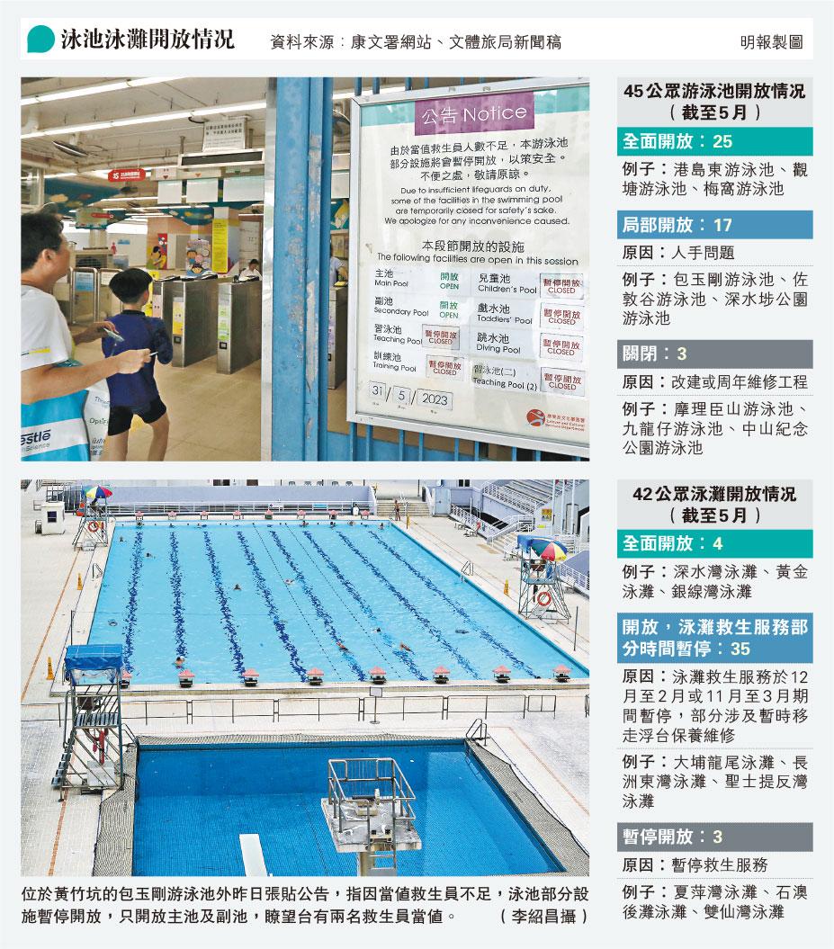 康文署昨稱,截至5月1日,受聘於署方的救生員包括1400多個長期服務救生員及200多個合約救生員。全港45個公眾泳池中有25個全面開放,17個因人手問題局部開放,其餘3個因改建或周年維修工程需關閉。根據康文署網站,全港42個公眾泳灘(見表),除了3個暫停開放,有35個開放泳灘於冬季12月至2月或11月至3月期間暫停救生服務。