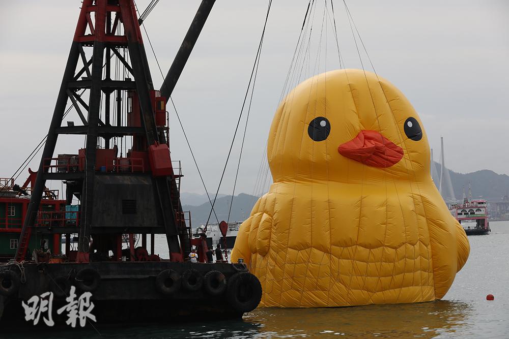 荷蘭藝術家霍夫曼創作的巨型黃色橡皮鴨今日(18日)於維港最後展出,展覽主辦機構早前宣布,其中一隻黃鴨將在今日海上巡遊後結束9日展期。該隻黃鴨今由多艘船「護航」,於下午1時許由中環出發,途經銅鑼灣、炮台山及尖沙嘴,至下午近4時完成海上巡遊,期間大批市民在維港兩岸「打卡」。傍晚6時許,巡遊完畢的黃鴨開始「放氣」,晚上約7時已接近放完氣。另一隻未有於海上巡遊的黃鴨,主辦機構料待至明早(19日)完成展出。