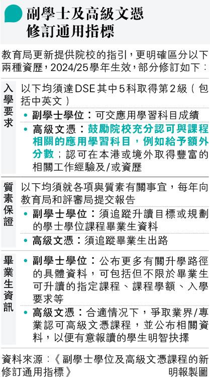 此外,教育局亦更新「副學士學位及高級文憑課程的新修訂通用指標」供院校參考,辦學時更明確區分兩者(見表)。教育局稱,高級文憑性質較專門,為職專教育的支柱,讓畢業生具穩固基礎及專業知識和技能,可即時投身輔助專業工作或升讀專業學位課程;副學士學位則多屬通識性質,為有能力及有志升學的畢業生提供升讀學位機會。
