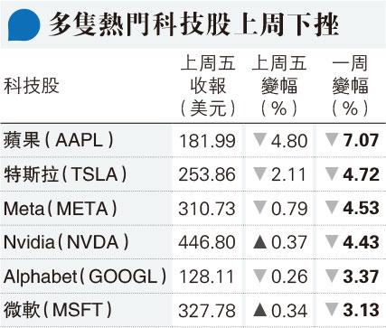 上周惠譽將美國主權評級,從最高評級下調一級,為2011年標普以後再被機構降級,帶動10年期美債孳息率重上4厘,多隻今年表現理想的科技股於上周下挫(見表)。沙特阿拉伯宣布延長減產,帶動紐油重上80美元,標指能源股指數上周升1.24%,加上受亞馬遜提振的可選消費股指數全周升0.72%,為11個行業指數中僅有兩個上升。