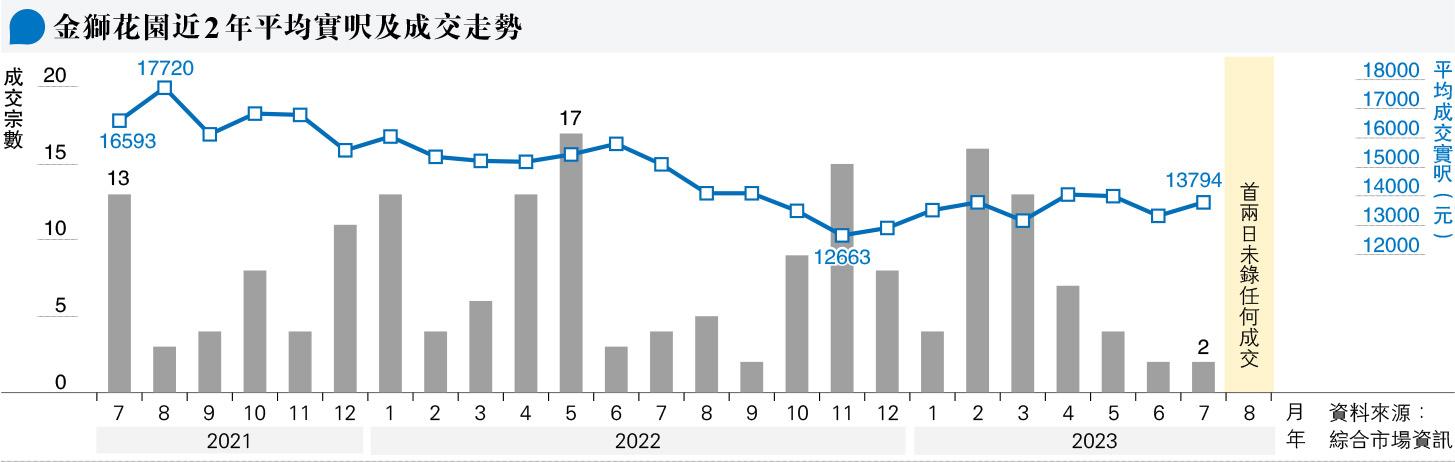 【明報專訊】整體二手樓市低迷,其中上車屋苑因買家對息口走勢較敏感,近月交投普遍疏落。大圍細價屋苑金獅花園,雖然近月租賃成交隨大市增加,但買賣成交量卻於低位徘徊,平均成交呎價僅在1.3萬元水平游走。
