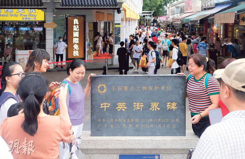 中英街今年1月隨通關而重開,現適逢暑假,人頭湧湧。向北走去,左面和右面的店舖分屬英界和華界,只見操普通話的旅行團都往左面湧去。右面的部分騎樓在2000年代重修,外觀較新派。在人來人往間,可見到舊的中英街街牌跨立於兩間商店之間,有的甚至變成掛袋架。中英街共有8塊界碑 ,其中一個擋在店舖正門,但遊人多沒有理會。界碑面向深圳一邊寫有「光緒二十四年 中英地界 第X號」,向香港的一面寫有「ANGLO-CHINESE BOUNDARY 1898 NO.X」。1941年日軍侵佔香港後曾移除3至7號界碑,後於1948年重立。1、2號界碑在華界中英街歷史博物館附近原位安放,8號則在沙頭角河橋下。
