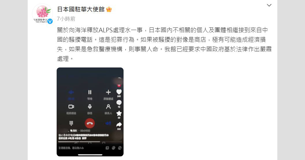 日本駐華大使館今天(26日)在官方微博帳號發文稱,關於向海洋釋放「ALPS處理水」(核污水)一事,日本國內不相關的個人及團體相繼接到來自中國的騷擾電話。使館方面強調「這是犯罪行為」,稱如果被騷擾的對象是商店,極有可能造成經濟損失;如是急救醫療機構,則事關人命。使館指出,已要求中國政府基於法律作出嚴肅處理。