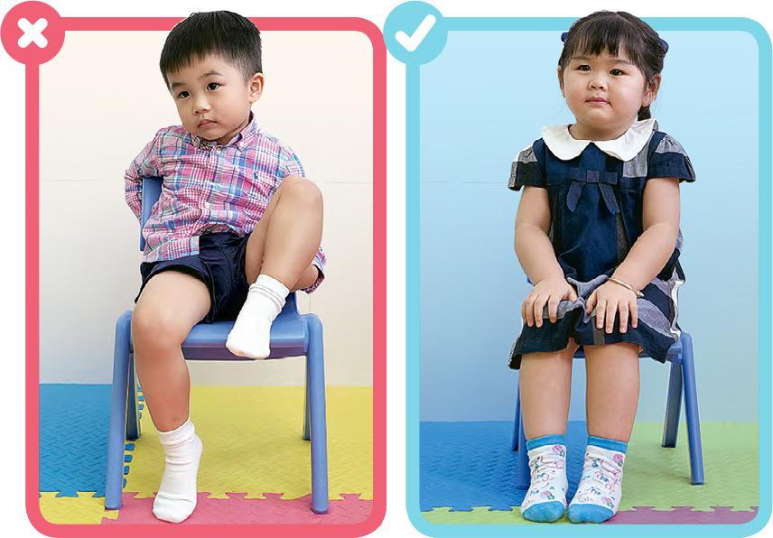 準備一些適合孩子高度的椅子,不單為了日後寫字時培養良好姿勢,也讓他們在家中可以練習面試時的正確坐姿:雙腳平穩貼板,雙手放在膝上(圖右)。如果孩子習慣雙手放膝,這也可避免他在面試時亂搞桌上物件。