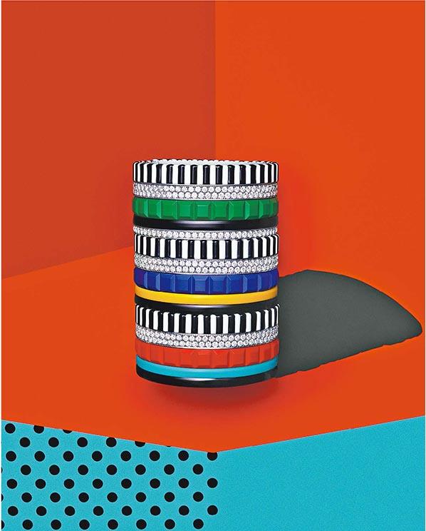 至於品牌的招牌設計Quatre手鐲和問號頸鏈也有新演繹。Puissance Quatre手鐲重新演繹系列的經典四行設計:第一行以鋁取代黃金,珠寶內外側均以手工塗上黑白色亮漆;第二排在鋁製鑲托上鑲嵌134顆鑽石;第三排以紅、藍及綠亮漆取代Clou de Paris圖案;最後一排以樹脂和鋁金屬製造,添上雙同心圓刻紋。Out of the Blue問號頸鏈則鑲嵌一顆珍罕的5.28卡枕形切割坦桑石,藍、黑和白色亮漆細緻重現經典花朵圖案,為平面的頸鏈營造立體錯覺。