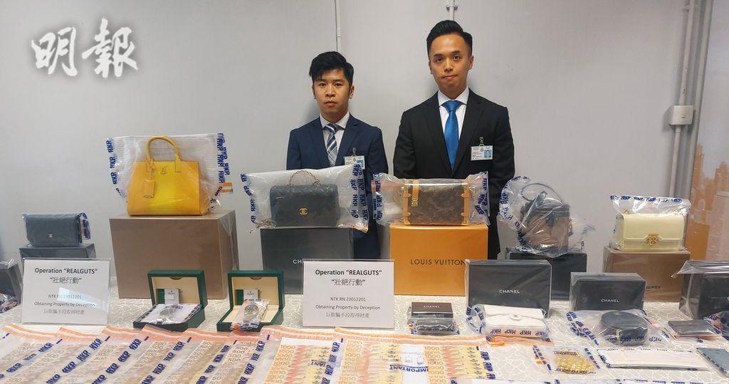經深入調查,發現集團主腦在青衣租用私人住宅單位作為儲存贓物,於前日展開埋伏行動,當男主腦在青衣接收被騙去的名牌手袋時帶返單位時,採取行動拘捕兩名集團主腦,分別為31歲男子及30歲女子,並在儲存贓物的住宅單位,起回兩隻名貴手表及19個名牌手袋,總值約100萬元,亦檢獲3本支票簿、一本帳簿、8部手提電話,22萬元現金及衣物等證物。其後再於昨日(5日)在秀茂坪及元朗拘捕1男2女骨幹成員。被捕5人包括一名中國籍男子、一名外籍女子、一名本地男子及兩名本地女子,年齡介乎30至60歲,涉嫌「以欺騙手段取得財產」。當中31歲中國籍男子及30歲女子已被控合共一項「以欺騙手段取得財產」罪,今日(6日)於觀塘裁判法院提堂;另外3名被捕人則獲准保釋候查,須於10月上旬向警方報到。