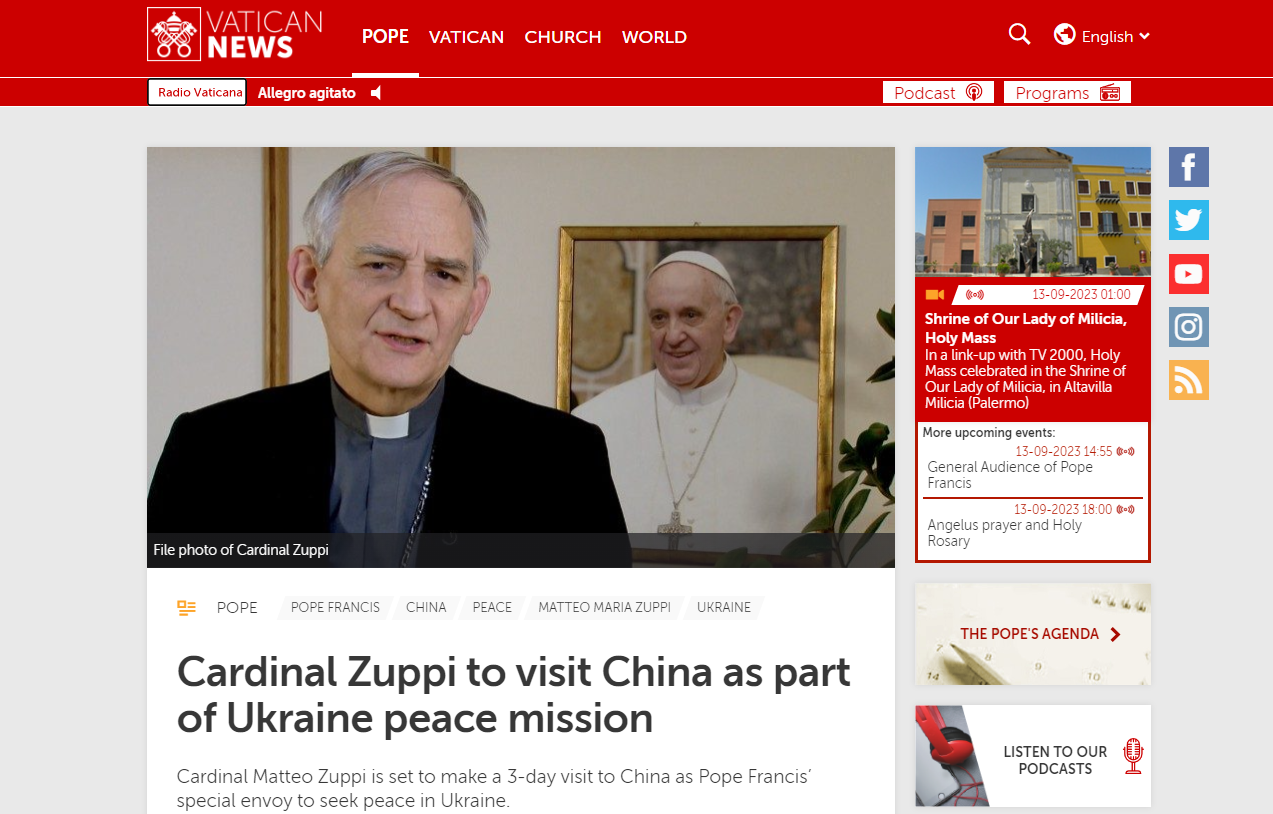 祖皮此行在一位教廷國務院官員陪同下訪京,可能於明天會晤中國國務院總理李強等政府高層官員。不過教廷宣布祖皮訪京的公告中,未直接點名提到俄羅斯或烏克蘭。