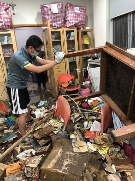 其中一名義工提到,該校中學部和小學部有大批義工支援,故義工集中協助情况同樣嚴峻的慈幼修院。他指慈幼修院的圖書館及神父居所遭淹沒,義工需要協助清理淤泥。他認為行動最具挑戰之處,在於神父及職員對慈幼修院有感情,故義工並非純粹清理,而是盡量在減低破壞程度下,把物件完整地保存及取出,包括不少珍貴的合照、以希伯來文書寫的宗教典籍,甚至是天主教的聖像等,再由職員協助整理。