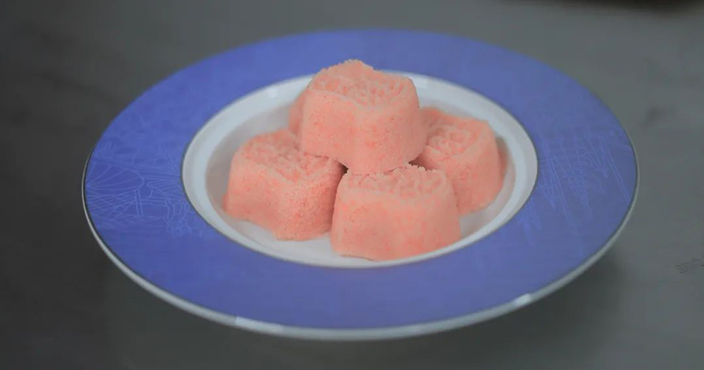 「定勝糕」傳統製法是用糖漬玫瑰混入面粉,製作出粉紅色糕粉,放入有「定勝」字眼的模具,加入豆沙和豬油餡,再蓋上一層糕粉,蒸煮而成。不少遊客到訪南潯都會一嘗「定勝糕」討個好意頭。