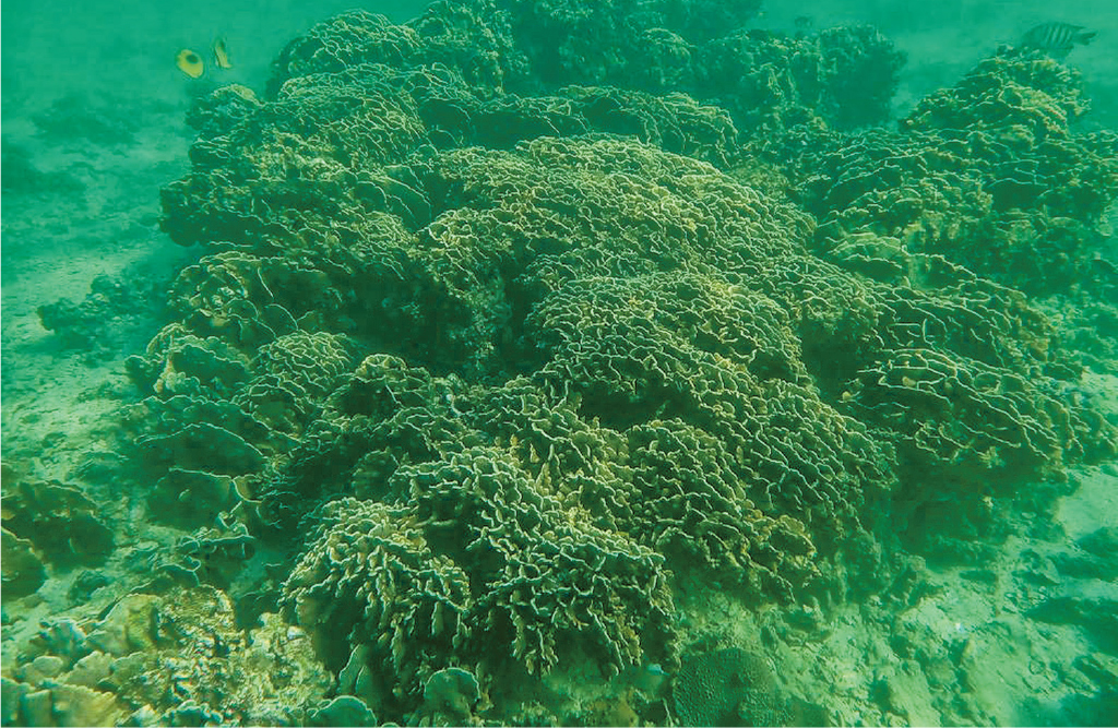 當我們再游往前方,他指向水更深的地帶時,浮潛面鏡前捲來了一大片完好無缺的十字牡丹珊瑚,那時刻直像俯瞰一片深褐色的古城般,城隅間躲藏着不同種類不同大小的蝴蝶魚,牠們晃游着,輕快地,像是體呈黃色身上擁有大黑斑的俗稱豆豉蝶,還有人字斑紋的人字蝶也在眼前略過。他再潛進深水區域,以照相機記錄面前景象,腦中同時閃現一個畫面,魚們去年不是傻頭傻腦衝着照相機而來嗎?這次並沒有,他想,該是通關後潛客漸減,魚們便再記不得潛客的餵養,不再把器材當作食糧,也終於回復本性了。
