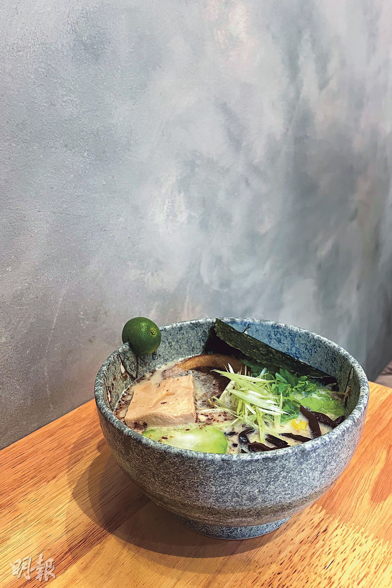 【明報專訊】大稻埕的迪化街商圈,集結不少百年老店、老宅街景,隱身在紅磚巷弄間的「無口小廚」,是近年當地討論度最高的素食餐廳之一,不少人也為他們的蔬菜拉麵而來。蔬菜拉麵有2款湯頭,分別是雪燕白湯和鹽味甘蔗湯,可再從9款口味如白味噌、川味擔擔等選配其一,混搭出10多款口味。