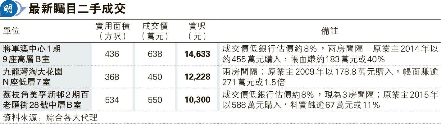 將中兩房售638萬 低估價8%