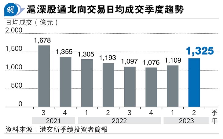 今年早前推出的滬深港通優化措施,包括每年增加10天左右的滬深港通交易天數,以及滬深股通北向交易可投資股份擴容,增加1000多隻A股供國際投資者交易。港交所資料顯示,今年第二季,滬深股通北向交易的日均成交額折合約1325億港元,按年增逾一成。