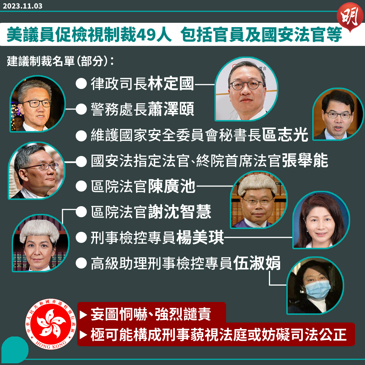 美國5名國會議員提案啟動立法程序,要求美國行政當局檢視49名香港法官、檢控官及政府官員等是否應列入制裁名單。新聞網站Politico報道,列入考慮制裁名單包括律政司長林定國、終院首席法官張舉能及所有常任法官、警務處長蕭澤頤、刑事檢控專員楊美琪、國安委秘書長區志光、23名現任或前任國安指定法官、15名檢控官,以及曾參與暴動及示威案檢控的外聘大律師吳美華。特區政府批評屬妄圖恫嚇,並強烈譴責,形容屬「拙劣政治戲碼和卑劣用心」,又指發表有意圖干擾或妨礙司法公正的言論,或作出有同樣意圖的行為,極有可能構成刑事藐視法庭罪或妨礙司法公正罪。