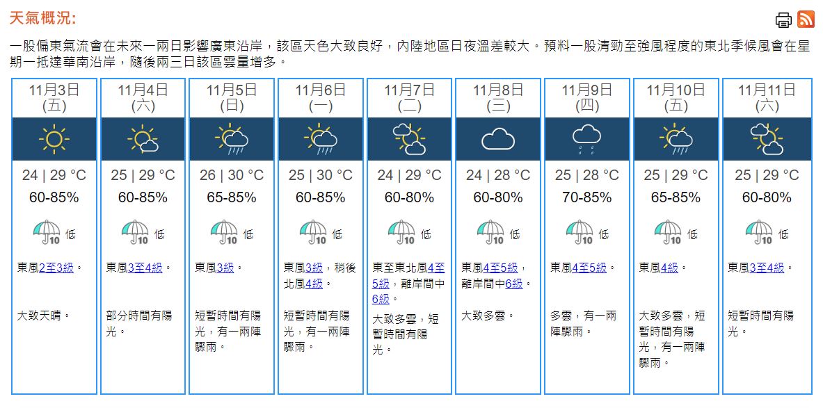即時熱點 天氣|天文台:天晴最高29°C 下周中期風勢較大 (08:51) 發佈於 2 年 前 2023 年 11 月 3 日 By 明報 上午8時30分,天文台錄得25.4°C,相對濕度79%。一股偏東氣流正影響廣東沿岸。本港地區今日(3日)天氣預測大致天晴,最高氣溫約29°C,吹輕微至和緩偏東風。展望明日(4日)部分時間有陽光,新界日夜溫差較大。隨後兩三日雲量增多,下周中期風勢較大。(天文台) 相關文章:天文台天氣天氣速遞 Up Next 日本天氣反常熱如夏季 時隔14年東京11月再現逾25度高溫 (16:35) 不要錯過 澳洲南非藍花楹綻放 街道染成藍紫色【多圖】 (13:40) 繼續閱讀 贊助商 猜你喜歡 天文台上午8時40分錄18.4°C 今年入秋以來最低 (09:03) 天文台取消所有熱帶氣旋警告信號 (18:20) 天氣|天文台:周三有幾陣雨 市區最低19°C (20:57) 風神 | 緩慢趨向西南 海口3港停運 (00:34) 風神|教育局:幼稚園及部分特殊學校明日停課 (17:33) 天文台:下午5時20分直接發出三號強風信號 (12:06)