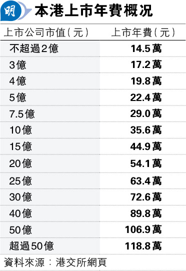 事實上,聯交所於計算上市年費中,會因應上市發行人的股本面值而計算,以市值不超過2億元的上市公司為例,聯交所需收取14.5萬元的上市年費(見表),超過2億元就會增加。