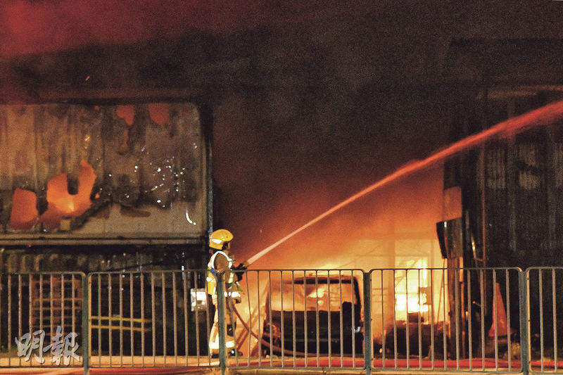 【明報專訊】昨凌晨零時許,元朗公庵路白沙村一間車房起火,並傳出爆炸聲,大量濃煙冒出。消防開喉灌救,火勢猛烈,波及鄰近單車貨倉及3層高村屋,消防將火警升為三級並增派人手,同時疏散30名居民及4隻狗。火警凌晨4時救熄,無人受傷,初步懷疑電力裝置引起火警。車房至少5輛車焚燬,東主趕回現場協助調查。單車貨倉及村屋屬同一村民擁有,倉庫鐵皮頂燒至塌下,外面堆滿大批燒焦單車。