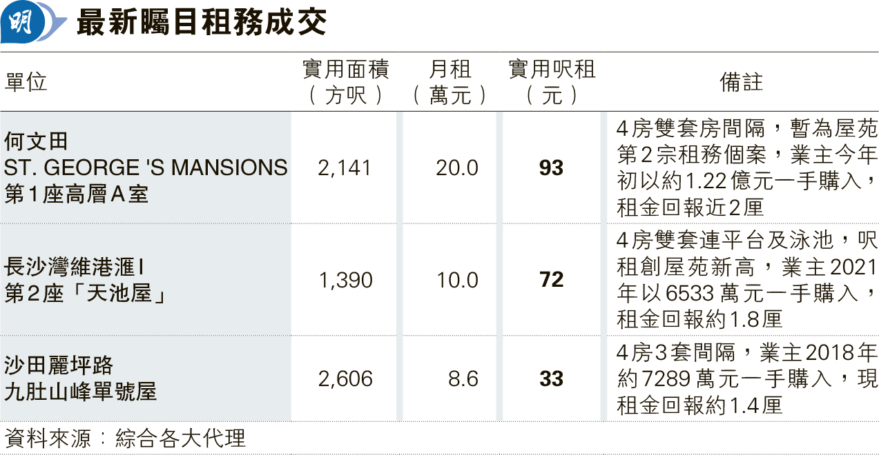 另信置及會德豐、嘉華(0173)等合作發展的西南九龍長沙灣維港滙I,最新錄內地專才以月租10萬元承租2座頂層「天池屋」,單位實用1390方呎,4房雙套間隔,連514方呎平台及泳池,據悉獲剛申請高才通的內地專才以月租10萬元承租,實用呎租高見約72元,屬屋苑呎租新高。原業主2021年6533萬元一手購入,租金回報約1.8厘。