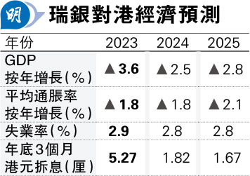 【明報專訊】瑞銀發表最新經濟預測,香港今年經濟增長料有3.6%,較政府預測的3.2%高,隨着經濟活動進一步正常化,以及政府措施幫助,未來數季經濟可保持擴張動力。不過香港作為金融和貿易中心,全球經濟增長存不確定性,明年本港經濟面對不少周期挑戰,瑞銀預料明年增速會放緩至2.5%。