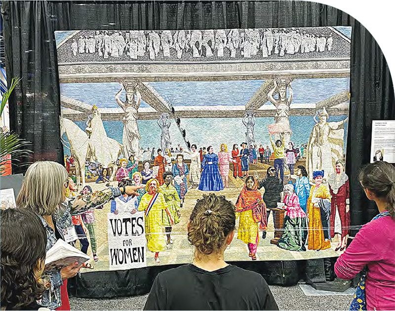 逛完市場,來到展覽區。有些作品尺寸巨大,布塊小得不能再小,不知道花了多少時間和眼力才做得出來。各展覽的主題也各異,除了常見的抽象圖案和自然景觀,也有一些關於社會議題的作品。例如,在一個關注女性權益的專題展覽中,有一件名為Women’s Work的大幅作品,圖中包括了歷史上和現在活躍的57名女性,人物由一層層不同顏色的小塊布料堆疊壓線而成。