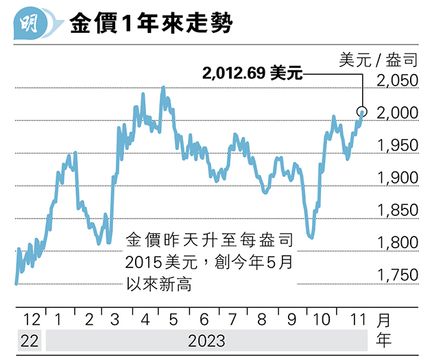 【明報專訊】美國通脹持續回落,就業等數據亦變差,令市場預期聯儲局加息周期已告終,美元轉弱。由於黃金沒有利息收益,走勢一般與息口、美元相反,所以金價過去兩星期節節上升,而且突破每盎司2000美元大關,高見2010美元以上,創超過半年高位。其他貴金屬昨晚亦普遍向好,銀價曾升約2%。