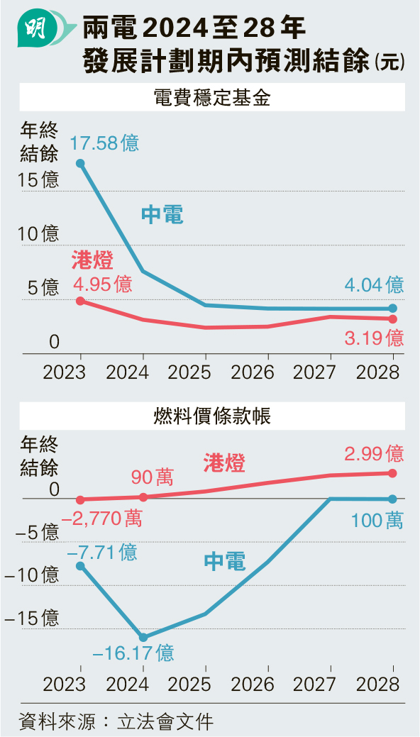 能源諮詢委員會前成員文志森分析,兩電均有動用電費穩定基金紓緩基本電費加幅,因此兩電預測明年電費穩定基金結餘均減少,當中又以中電減幅較大(見圖),年終結餘會由今年17.58億元減少10.04億元,至明年的7.54億元。
