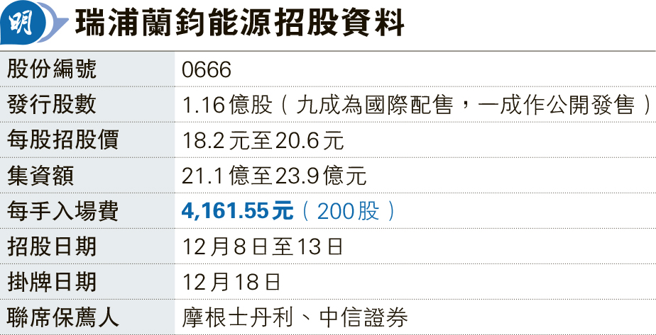 【明報專訊】瑞浦蘭鈞能源(0666)今日開始招股,12月18日上市。全球共發售1.16億股,香港發售佔一成。招股價介乎18.2至20.6元,以每手200股計,一手入場費4161.55元。最多集資23.9億元(見表),假設以上限價定價,集資額將排行今年第四大新股IPO。摩根士丹利及中信證券為聯席保薦人。