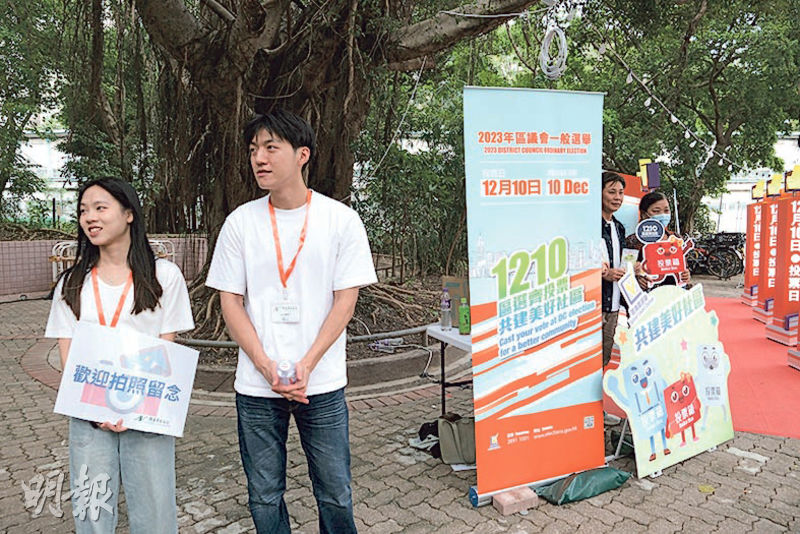 【明報專訊】為鼓勵市民投票,政府噚日喺票站旁設「打卡位」畀市民拍照留念,Emily噚日下晝喺上水港鐵站附近嘅「鄰近邊境投票站」外,發現數名身上掛有「北區青年協會」名牌嘅義工以普通話交談,其中一人拎住印有「歡迎拍照留念」嘅牌。Emily上前了解,佢哋話自己係深圳大學嘅學生,受深圳大學學生會召集來港做義工,喺票站外協助市民投票同打卡,另一義工話自己有權投票,噚日來港後投票,然後喺票站外做義工。