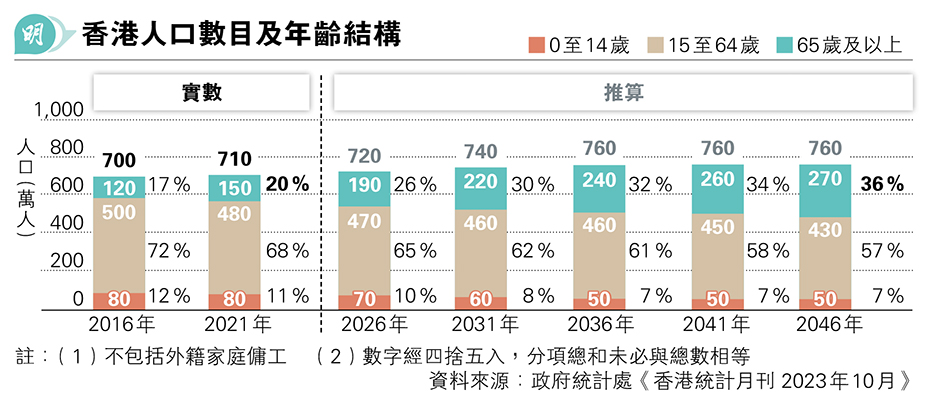 政府統計處早前公布的《香港人口推算2022-2046》報告指出,根據2021年人口普查結果,2021年中本港總人口約741萬人,當中65歲或以上長者約145萬人,佔總人口約20.5%,隨着戰後嬰兒潮出生的人士踏入老年,以及預期人均壽命繼續上升,加上生育率維持於低水平,處方按2021年中人口為基準,並撇除外籍家庭傭工推算,預計到2046年本港65歲及以上的長者人口將較2021年增加129萬人,至大約270萬人,佔總人口36%(見圖)。據聯合國人口分析,估計到2050年本港65歲及以上人口比例將達40.6%,成為全球人口老化程度最高城市。