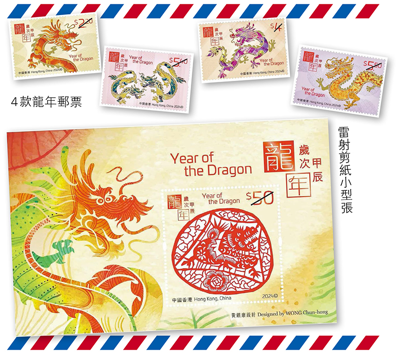 「歲次甲辰(龍年)」郵票係郵政局賀歲生肖郵票第五輯入面發行嘅第一套,一套有4枚郵票及兩張郵票小型張,分別配有唔同圖像元素及顏色嘅龍圖案,當中一枚套用雷射剪紙技術刻劃龍剪影嘅小型張郵票更係首次發行。