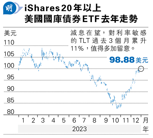 縱觀去年底多家基金公司對今年展望,也近乎一致看好債券表現,主因減息在即,近日美國10年期國債孳息率曾跌至3.83厘水平,即債價回升;以對利率敏感的iShares 20年以上美國國庫債券ETF(美:TLT)為例,過去3個月價格累升11%(見圖),值得多加留意。