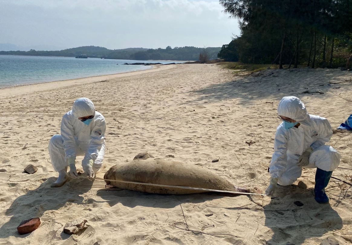 東平洲昨(7日)有一條江豚擱淺,香港海洋公園保育基金接報到場跟進,已將江豚帶回海洋公園作詳細解剖及分析。香港海洋公園保育基金表示,擱淺的是一條成年江豚,身長約143厘米,屍身已嚴重腐爛,屬香港海洋公園保育基金今年處理的第一宗鯨豚擱淺個案。
