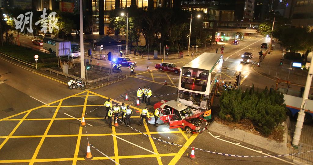 【15日01:21更新】意外後,的士59歲男乘客及47歲內地女乘客,送院搶救後先後傷重不治。現場港灣道分別有東、西方向行車線,不同方向均有交通燈,同時指示駛過菲林明道或停車。