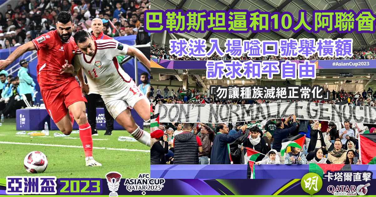 與港足同在亞洲盃C組的巴勒斯坦隊,今晨(19日)獲眾多支持者入場打氣下,憑對方的烏龍球以1:1逼和最終10人應戰的阿聯酋隊。而這個受以巴衝突影響的中東國家,獲場內球迷不斷高呼「Free Palestine(解放巴勒斯坦)」之餘,甚至展示大型標語橫額以作聲援。