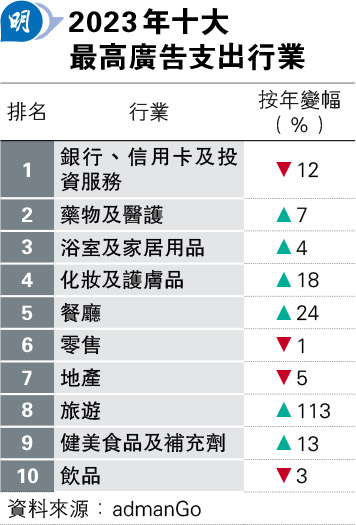 至於2023年十大最高廣告支出行業中,金融地產隨着本港股市樓市雙跌,連帶廣告開支亦見下跌;而疫後復常,港人旅遊需求出現「爆發式」增長,則帶動旅遊業廣告開支大增1.13倍,排名由2022年的20名急升至去年的第8名(見表)。