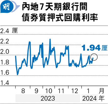 債券回購業務,是指需要融資的機構可將債券賣出給借出資金的機構,同時雙方約定在指定時間,由融資方以約定的價格購回債券,並支付相關利息等費用,人行擬向外資開放業務。有交易員預期,外資會較多向境內機構借出資金,不過目前內地市場利率較低,需評估是否參與。作為內地銀行資金成本的指標,7天期銀行間債券質押式回購利率(DR007)昨日報1.9405厘(見圖),上月以來大部分時間低於2厘。