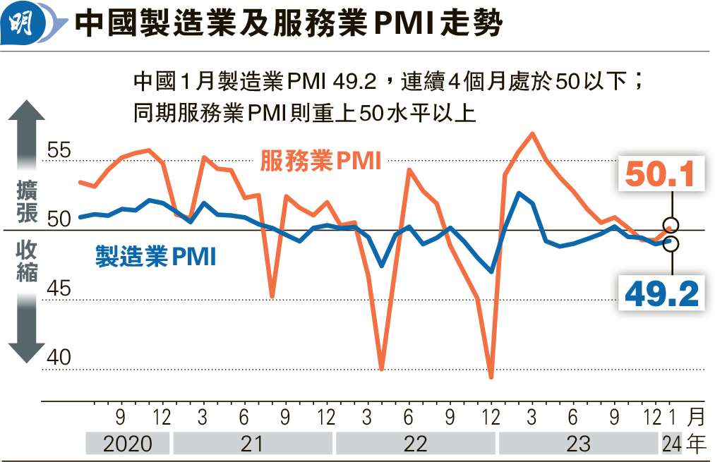 從企業規模看,大型企業PMI按月升0.4點至50.4,惟中小企業PMI仍處於收縮區域,中型企業PMI按月升0.2點至48.9,小型企業PMI則按月跌0.1點至47.2。