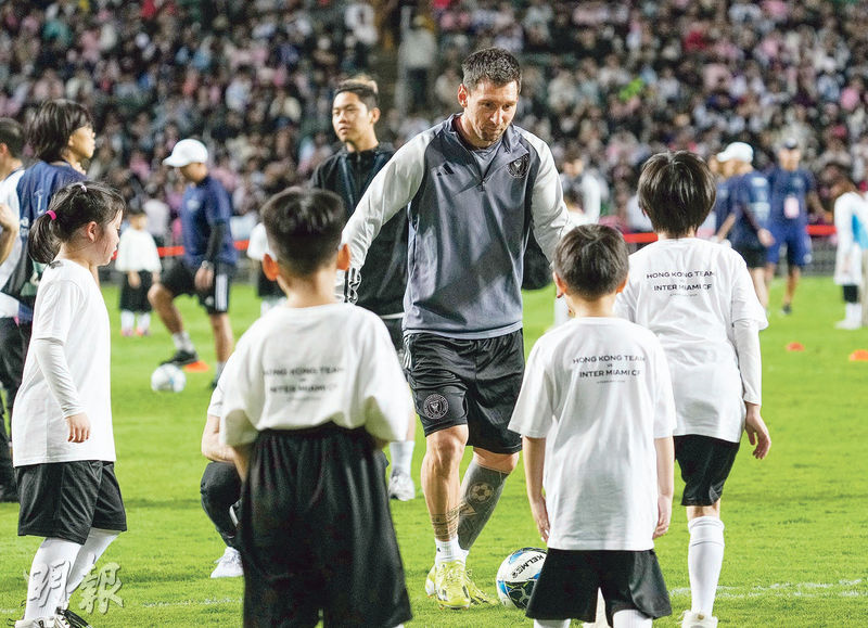 【明報專訊】阿根廷球王美斯昨午率領美職球會國際邁阿密球員參與公開操練,吸引39,916名球迷入場,但美斯其間僅輕舒腳頭,今午對香港隊的表演賽能否正選成疑。操練期間先後有數名球迷衝入球場,當中有一名球迷成功突圍取得美斯簽名後,更即場跪拜偶像。大部分球員操練後未有留步為場邊觀眾簽名合照,不過班主之一「萬人迷」碧咸現身觀操之餘,更在尾聲「腳痕」落場指導學童兼大合照,盡顯「暖男」親民一面。