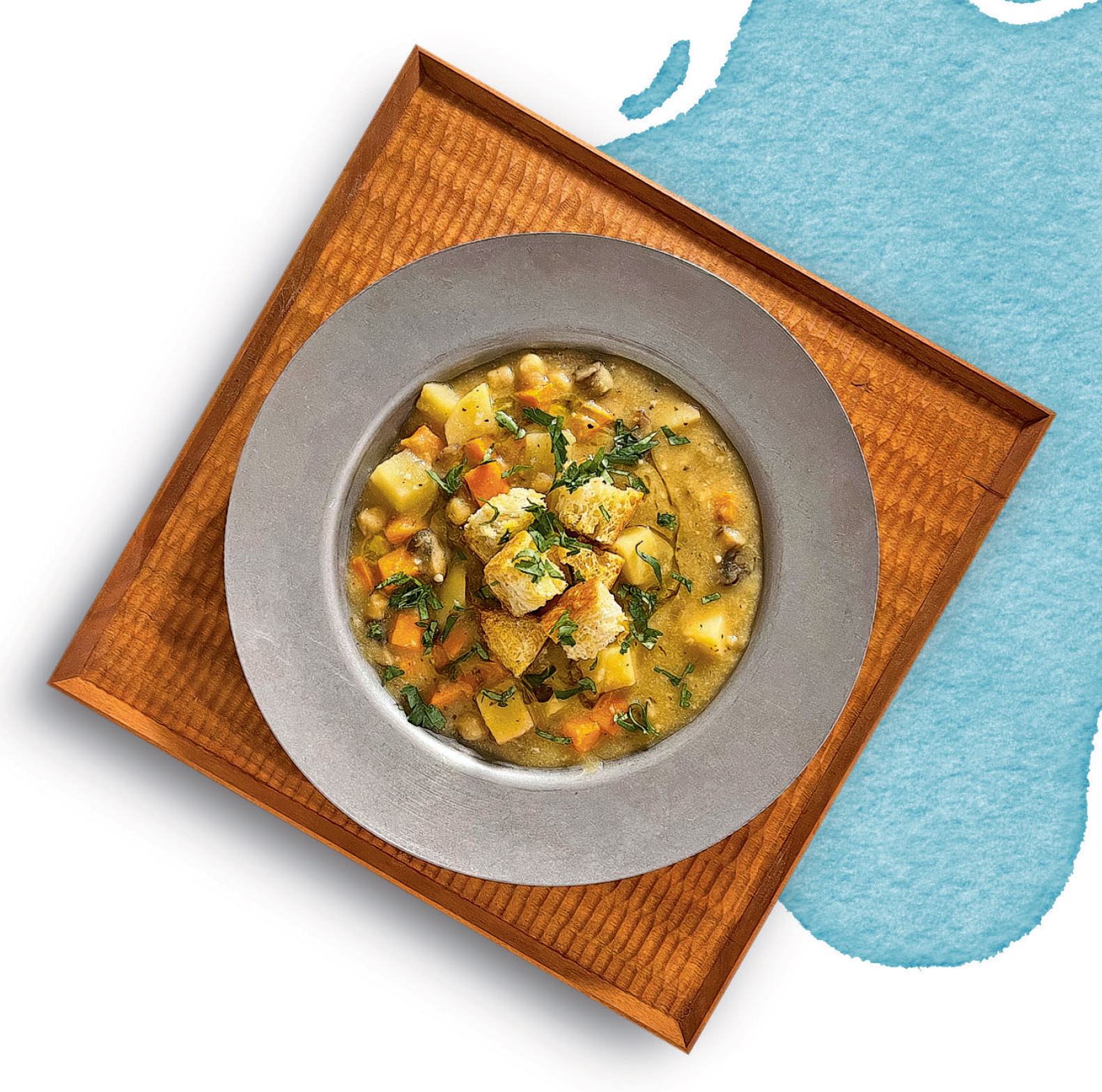 8.將薯仔鷹嘴豆泥、剩下的鷹嘴豆連煮鷹嘴豆的水都加到鍋中,以小火煮10至15分鐘,如太濃稠,酌量加入餘下的昆布湯稀釋。以百里香、鹽麴、檸檬汁和黑胡椒粉調味。上菜時放上麵包丁、淋一圈橄欖油和撒上芫荽碎,完成。