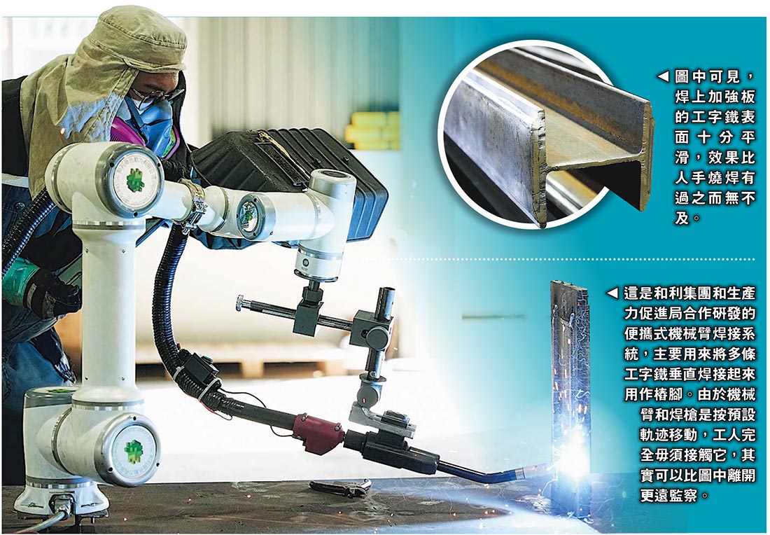 【明報專訊】建造業勞動強度大,不易吸引年輕一代入行。其中燒焊工人需要面對高熱、強光和難聞的氣體,行內青黃不接、後繼乏人的情况特別嚴重。為此,有本地公司就利用機械臂研發了兩款自動焊接系統,除了提高效率,還大幅改善了燒焊工人的工作環境。