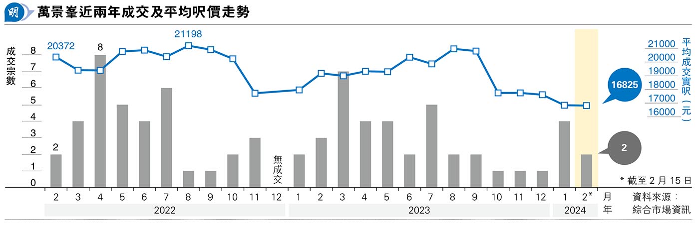 【明報專訊】2月本港樓市受新春節日長假影響,加上新《財政預算案》出台在即,二手市場觀望氣氛濃厚,不少屋苑成交量均見回落;荃灣萬景峯2月截至15日,暫時錄約兩宗成交,雖然交投仍疏落,但成交價已見回穩,成交均呎維持在1.6萬餘元水平。