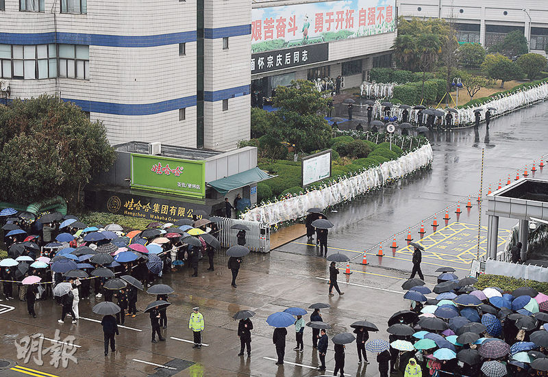 【明報專訊】娃哈哈集團創始人、董事長宗慶後追思會昨在浙江杭州娃哈哈集團有限公司下沙基地舉行。杭州昨日有雨,不少市民和集團員工仍冒雨前來送別宗慶後。
