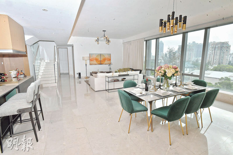 明寓所有分層標準單位早前已售出。今次介紹的11樓、12樓B室,屬餘下3伙待售一手複式單位之一,實用面積2718方呎,採4房雙套間隔,單位入口以子母門設計,下層大致分為3個區域,白色為主調大廳面積約645方呎,客廳、飯廳擁有十分充裕空間,客廳擺放米白色曲尺形梳化,擺放電視機位置,掛上一幅大型畫作,為室內作美化點綴。飯廳擺放長形雲石餐桌,足夠8人一同用膳,配襯綠色餐椅特別搶眼。