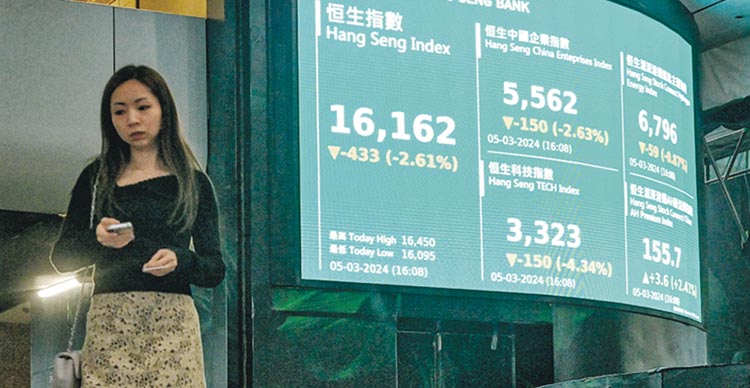 【明報專訊】國務院總理李强發表政府工作報告,將今年經濟增長目標訂為5%左右,承認「實現今年預期目標並非易事」。工作報告平實、驚喜不大,港股借勢調整,曾跌500點,收市報16,162點,跌433點,並跌穿50天線。重磅科網、新能源車股沽壓大,科指跌逾4%,跑輸大市。大市成交連續6日逾千億元。港股通北水淨流入近60億元,為一周多來高位。分析指市場對內地未有提出實質措施挽救經濟感失望,但外資大行似看到資金流向有改善的迹象。