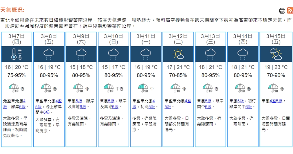 【16:35】東北季候風正為廣東沿岸帶來較涼的天氣,天文台表示,本港今晚(6日)氣溫會逐步降至晚上約19℃。預測今晚及明日(7日)大致多雲,早晚有幾陣雨。初時能見度較低。明日早晚清涼,市區最低氣溫約16℃,新界再低一兩度。最高氣溫約20℃。吹和緩北至東北風,離岸風勢清勁。展望本周五(8日)早晚清涼。周末期間至下周一(11日)氣溫進一步下降及有雨。(天文台)